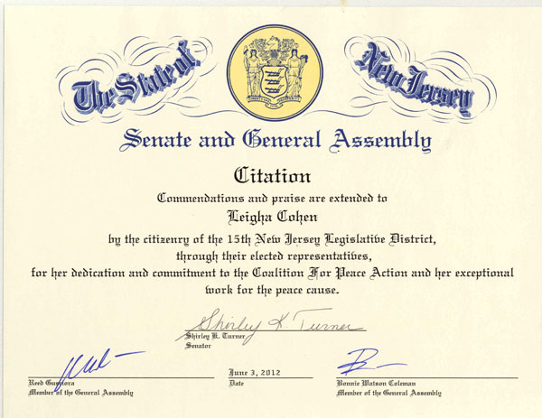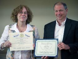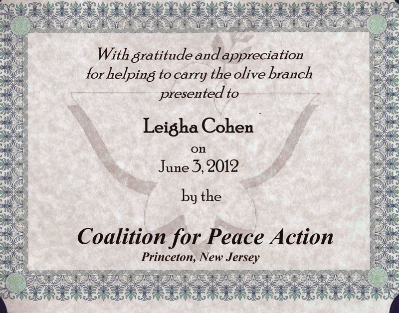 | Leigha Cohen Recognized Princeton TV member Leigha Cohen was honored by The Coalition for Peace Action (CFPA) and earned a citation from NJ State and senate for her volunteer work for CFPA. Presenting her award was Princeton TV's Executive Director George McCollough. Photo by Anna Savoia |